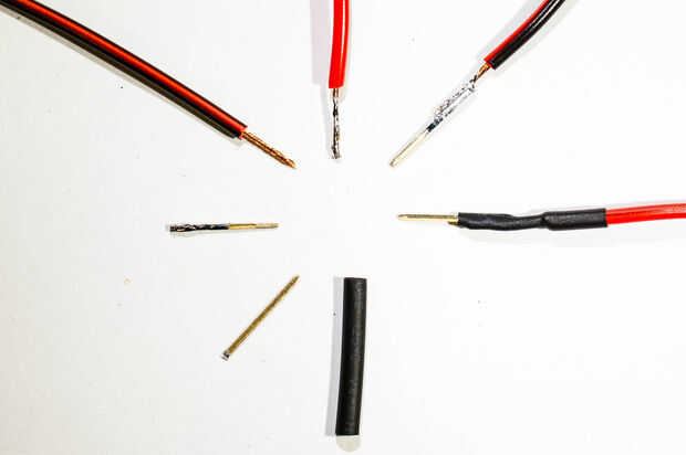 6. Empuje el tubo del encogimiento del calor sobre la conexión soldada, sólo hasta el punto donde se cubre toda la lata en el pasador. Sólo limpia pin debe ser visible. Asegúrese de que es tiempo suficiente para también terminar sobre el aislamiento del cable.