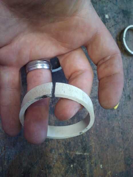 • Corte 1 anillo como se ve en la imagen de arriba. Desea estimar y reducir el diámetro del anillo del corte para que se ajuste bien en el anillo principal sin cortar. Tirar el anillo de corte en una olla con agua hirviendo durante unos segundos ya que suaviza para arriba y hace más fácil la forma y entra en el anillo principal. Deje que se enfríe en su lugar porque cuando se enfría el PVC, trys para volver a su forma original. Restringe el tener dentro del anillo principal, mientras que se refresca es expansión. :) (Ver siguiente paso foto de esto)