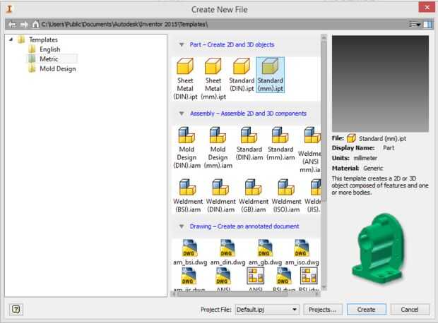 2. luego vaya a la carpeta métrica y seleccione el archivo de .ipt mm estándar. (Resaltada en la imagen)
