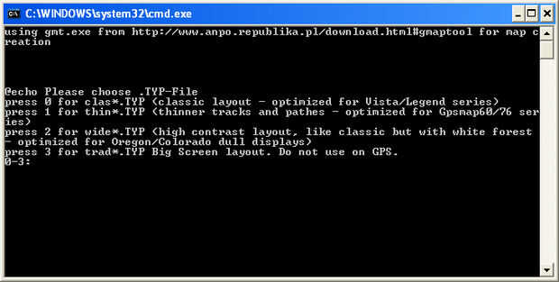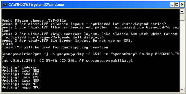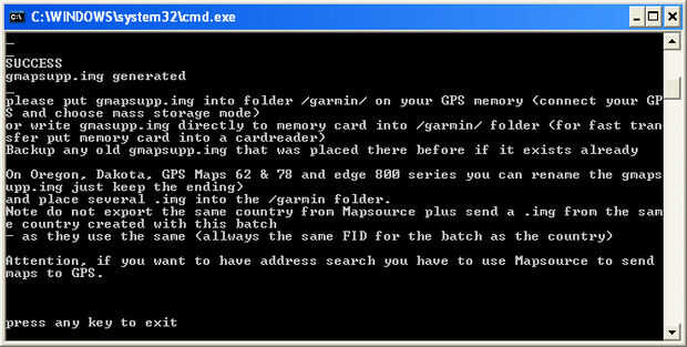 Este archivo por lotes utiliza el programa "gmt.exe" que también se proporciona para combinar el azulejo individual hay muchos archivos en uno grande "gmapsupp.img" que luego pueden cargarse en el dispositivo.