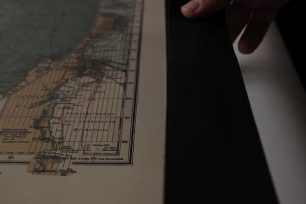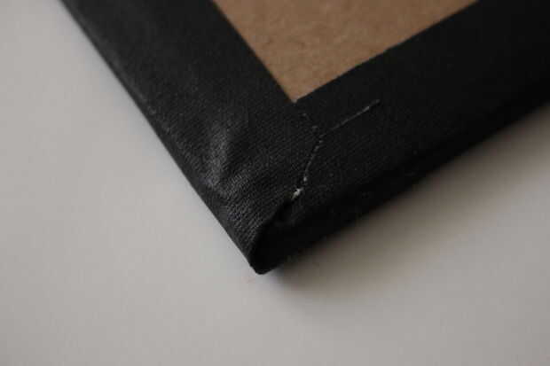 Ahora estás listo para poner las tres piezas - hoja, cuadro/cartel, cartón de respaldo - junto con la ayuda de su cinta negra de garfio. Dado que la frontera será aproximadamente 1" de ancho, me pareció útil para estafar pequeñas hebras de cinta y utilizar éstos para asegurarse de que las tres piezas se unen completamente para que usted no tiene que preocuparse de cosas pasando cuando construyes tu frontera.