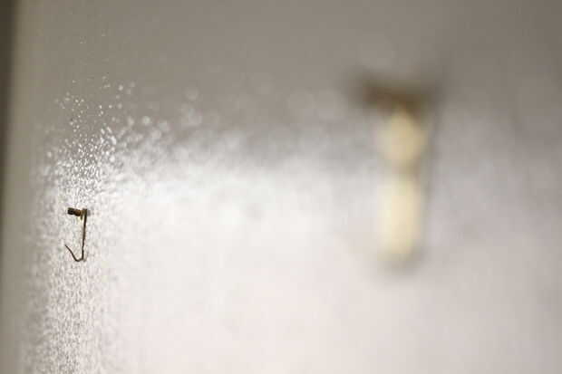 Para montar el cuadro, elige la zona aproximada en la pared donde quieres la imagen y uñas en dos 'enganchado' soportes de imagen paralelo a uno otro. Una de las bellezas de este diseño es que usted no necesita tener las suspensiones en un punto preciso, porque sólo vas a usar el gancho inferior de las suspensiones para pegar en el cartón de su marco. Presione el marco contra las suspensiones y bajar ligeramente a perforar los ganchos en la parte posterior de la cartulina. Tenga cuidado de no empujar demasiado duro para asegurar que no cortan el cuadro o cartel con los ganchos de las perchas. Puede retroceder y asegúrese de que la colocación es buena y el marco es de nivel y puede simplemente sacar el marco y reajustar si es necesario.