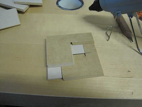 Una vez haya confirmado todo, retire las piezas de la capa superior, manteniendo su orientación de la misma. Aplicar un punto de pegamento caliente donde las marcas X, luego ponen la pieza que se muestra arriba a la izquierda detrás en su posición. Alinee los bordes de las piernas pequeño para que las superficies queden al ras.