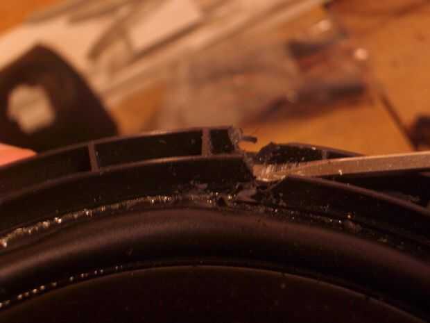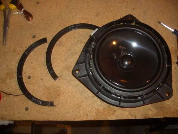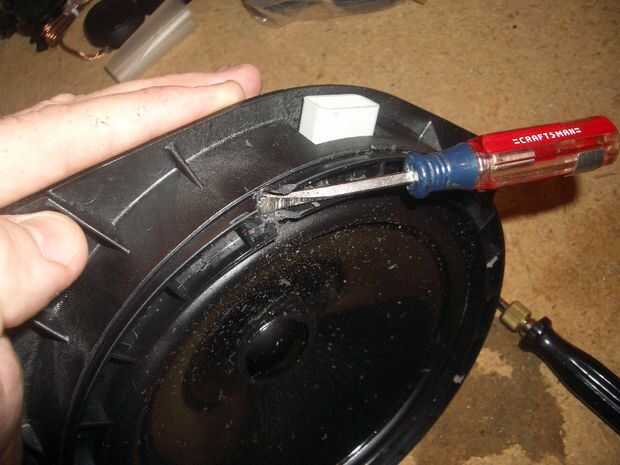 Mientras miraba en el altavoz pude ver que el cono del altavoz parece estar pegado al cuerpo y retenida por un anillo de plástico. Resulta que el pegamento usado para unir esta cosa es papilla más débil de lo que pensaba. Originalmente pensé que iba a tener que calentar para arriba pero que resultó para ser innecesario. Además el nivel de sub, en que el anillo se encuentra es hueco por lo que todo lo que tienes que hacer es un agujero en el anillo de clase y entonces debajo de él y haga palanca (ver foto 1 y 2). Sólo sigue haciendo palanca alrededor de todo el camino y acabarás como la tercer foto mucho más fácil de lo que esperaba.