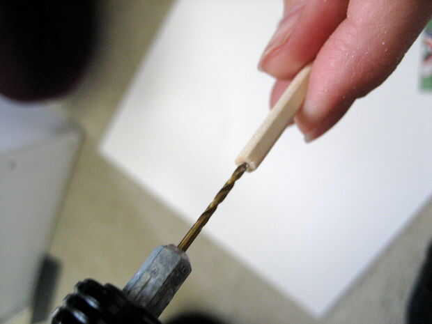 Taladrar un agujero en el objeto están haciendo su manija.  En este caso, estoy usando un viejo juego de los palillos.  El agujero debe ser lo suficientemente grande como para adaptarse a la cantidad de cabello / cerdas que quiera pero no demasiado grande que se rompe la manija.