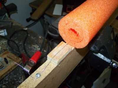 Extienda la sección de fideos en la superficie de la cama como el alambre caliente corta la espuma. Ir a una velocidad lenta que no fuerce el cable. Mantener el centro de los tallarines directamente sobre el cable.