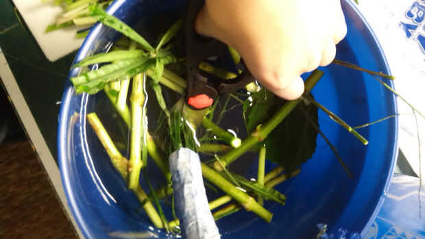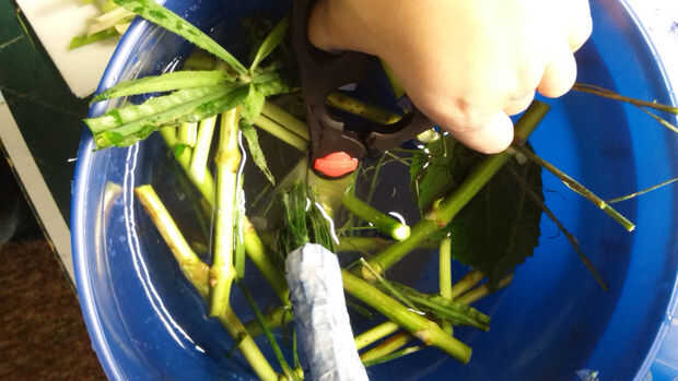 Coloque los tallos en un cubo de agua antes de cortar los tallos. Corte los tallos bajo el agua ayudará con absorción de agua y ayudar a que las flores duran más tiempo.