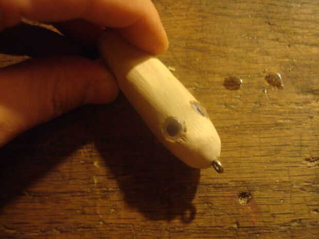 perforé algunos pequeños agujeros en los ojos serían entonces perforaron agujeros grandes por lo que los ojos de arte encajan perfectamente (trata de no perforar muy profundo!) Hay una pequeña pestaña en los ojos, cortó para que encajen en los orificios redondos. Después de comprobar el ajuste, superglued en. Se ve como cebo ya!