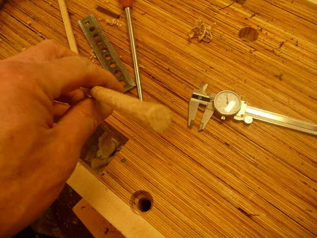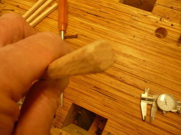 Comenzar golpeando el palo cuadrado a través del orificio más grande, dos veces. (Yo libra a través de un agujero en mi banco). Entonces mueva hacia abajo con el agujero más pequeño siguiente y otra vez libra dos veces. Continúe este proceso hasta haber usado todos los agujeros. La segunda foto muestra la espiga parcialmente a través del proceso, mientras que la tercera foto muestra la espiga completa.