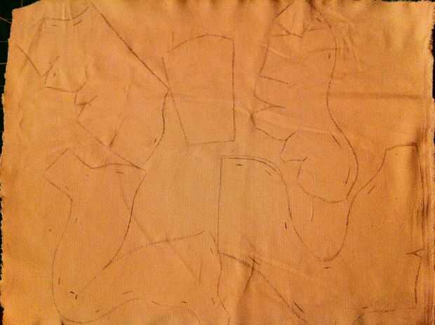 Ligeramente con un lápiz o marcador, delinear los patrones en la tela y no olvide marcar el margen de costura en los agujeros en el ultimo paso.