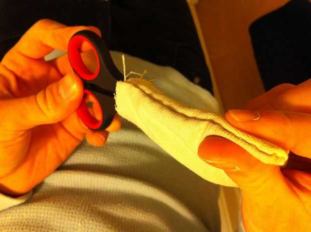 En este paso usted desea virar en la lengua de zapato con unos puntos de sutura en lugares discretos.