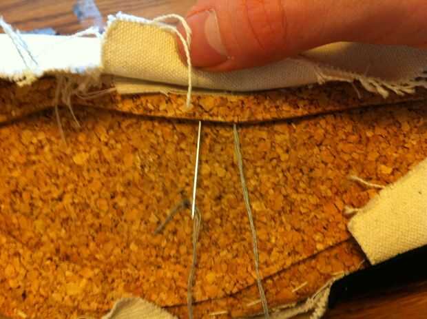 Ahora, usando como gruesa una cadena como, puntada a través del tejido, a través del anillo de suela y la espalda, continuando alrededor de la zapatilla entera tirando a tela apretada medida que avanza.