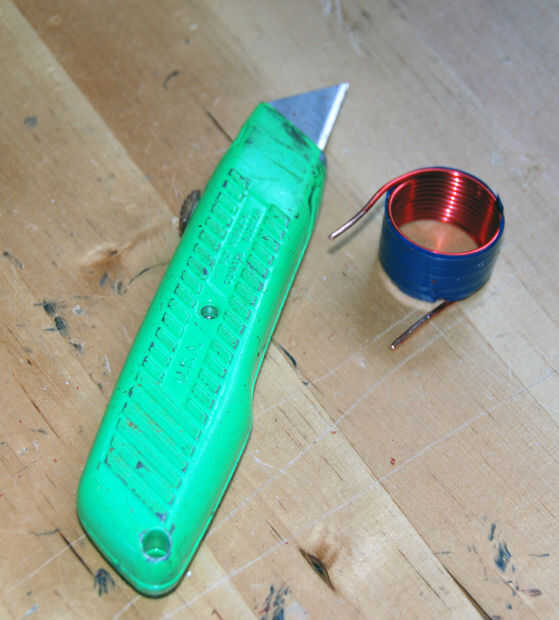 Porque el alambre magnético utilizado aquí debe estar revestido (así que ninguno de los carbones realmente conectar eléctricamente entre sí), nos debemos raspe lo si queremos utilizar el inductor. Forma más sencilla es usando un cuchillo como en la imagen.