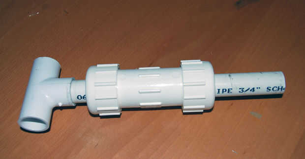 Poner el conector en T en el tubo de 3/4"- será el mango torneado. Deslice el tubo en la compresión común (otra vez, si eso es lo que se llama) asegurándose de que la tubería de 3/4" es lo suficientemente suelta para girar.