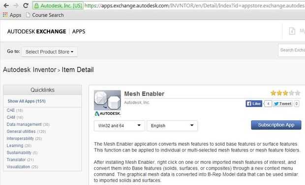 Ir a la aplicación de suscripción Página para Autodesk malla Enabler, que permite convertir una malla a una función de base sólida una vez que el archivo se importa en Inventor. Sólo descargar la aplicación y cerrar el Inventor. Cuando reinicie Inventor, automáticamente que va empotrado en el programa.