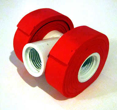 Despegue el papel del forro y envuelven un número igual de tiras alrededor de cada uno de los extremos opuestos de la t de PVC (lado adhesivo para PVC). Utilicé tiras de 3 por cada lado. Presione firmemente la espuma como vas a conseguir un acabado limpio agradable.