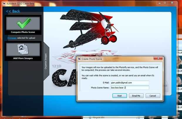 Una vez que los archivos son subidos, puede presionar el botón para crear foto escena. En este punto, me haga clic en el enlace debajo del botón y pide ser enviado por correo electrónico una vez realizado el proceso. El cuadro de diálogo retendrá el título de escena y la dirección de correo electrónico que escribiste antes.