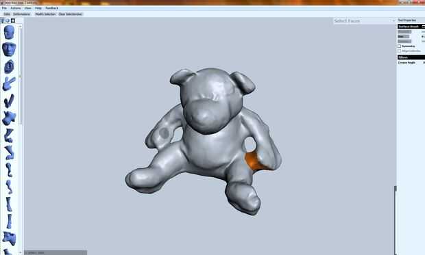 - Haga clic en el botón Select en Meshmixer. Esto le permite "pintar" una selección en el modelo. Girando la rueda del ratón o cambiando el valor en la barra lateral a la derecha, puede variar el tamaño de la selección. Si selecciona demasiado, presione Mayús y arrastre el ratón para eliminar áreas de la selección.