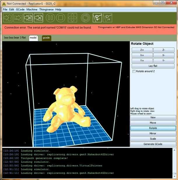 - Haga clic en el botón de movimiento en la barra lateral ReplicatorG. Haga clic en los botones del centro y poner en la plataforma. Ahora verá el objeto.