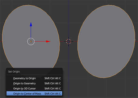 Debe seleccionarse el ojo de la derecha. Añadir a esta selección por 'Shift + RT clic' sobre el ojo izquierdo. Con los dos ojos seleccionados, pulsa 'Ctrl + j' a unirse a ellos como un objeto. Queremos que el manipulador del objeto en el centro así que Pulse y mantenga pulsado Shift + Ctrl + Alt + cy seleccioneorigen al centro de masaen el cuadro de diálogo que aparece.