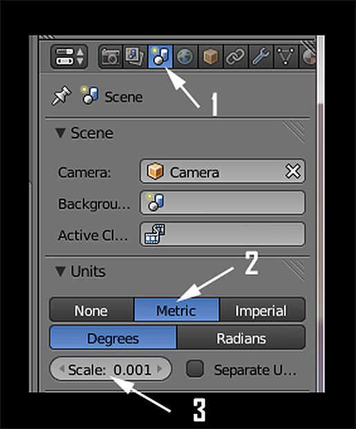 Iniciar Blender y cerca de la esquina superior derecha, haga clic en el icono de la escena (1). Valores por defecto en la licuadora a una unidad de medida llaman unidades de Blender. Para este tutorial, cambiar las unidades métricas (2). Estaremos así medir en milímetros establece la escala a.001 (3).