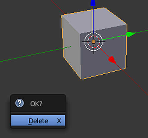 Escena de mezcladores por defecto contiene un cubo. Ya debe estar seleccionado. Se puede saber si éste es elegido por el contorno naranja delgado alrededor de él. Si no lo es, haga clic en la Rt sobre el cubo para seleccionarlo. Presione Delete y haga clic en 'Eliminar' en el cuadro de diálogo que aparece. El cubo debe ser ahora desaparecido.