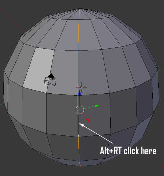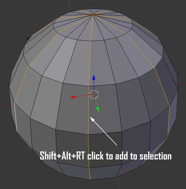 Queremos seleccionar un anillo de bordes de arriba hacia abajo, así que mientras mantenga pulsado clic 'Alt' rt en un borde que se muestra. Usted tendrá que añadir a la selección que acaba de hacer para ir a los izquierda 3 bordes y esta vez Seleccione el borde mientras mantiene 'Shift' y 'Alt' mientras hace clic en Rt. Continúe alrededor de la esfera de selección de cada cadena 3 de bordes con 'Shift' y 'Alt' mientras hace clic en Rt. (Mantenga pulsado el botón central del ratón para girar alrededor de la escena)