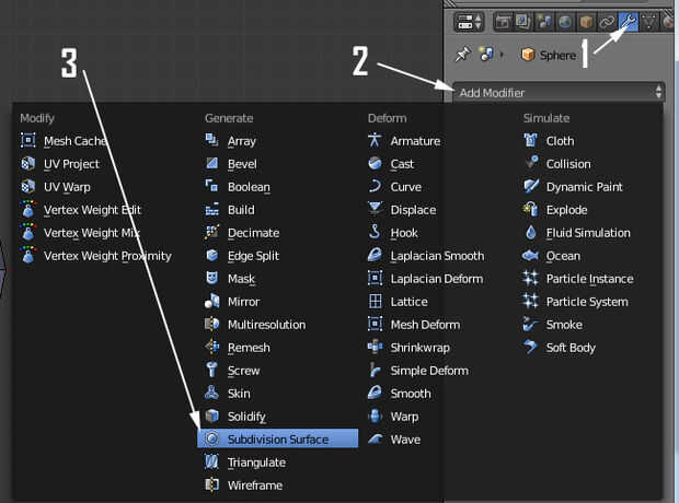 Queremos suavizar a los filos de la calabaza para darle una forma más orgánica. Lo hacemos con un modificador de la superficie de subdivisión. En el panel derecho de propiedades, haga clic en el icono de llave inglesa (1). Haga clic en 'Añadir el modificador' (2) y escoge la superficie de la subdivisión (3).