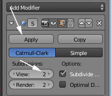 Cambiar la 'vista de subdivisión' a 2. Usted está en modo de edición. Presione 'Tab' para entrar en modo de 'Objeto' y pulse 'aplicar' (que sólo puede aplicar modificadores en modo objeto).