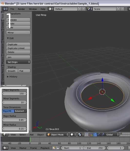 2. aplicar la configuración de mi. Recuerde, usted debe cambiar antes de hacer cualquier cosa con el toro o se puede cambiar más adelante. configuración: principales segmentos: 150, segmentos menores: 10, principales radio: 0,85, radio menor: 0,15 y dejar el resto sin cambios. Si mi configuración no está claros, ver cuadro 1