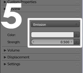 5. aplicar estos ajustes: set de "Difuso" a la "Emisión", color blanco, fuerza a 0.500 (véase el cuadro