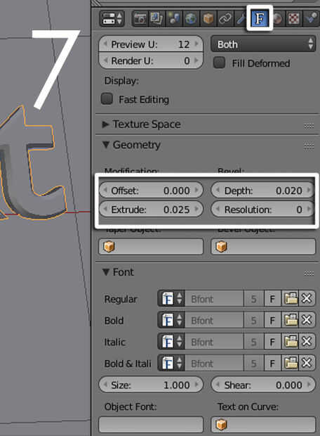 7. grueso de "Extrusión" o poner en el "texto" por ir al panel derecho de propiedades y presione la "F" cerca el cristal de la bola. Es el menú de propiedades para el texto. ahora Desplácese hacia abajo hasta ver "Geometría" aplicar ahora mi configuración: modificación: Set sacan a profundidad de bisel 0.025 0.020 (véase el cuadro
