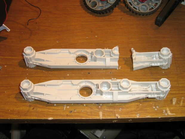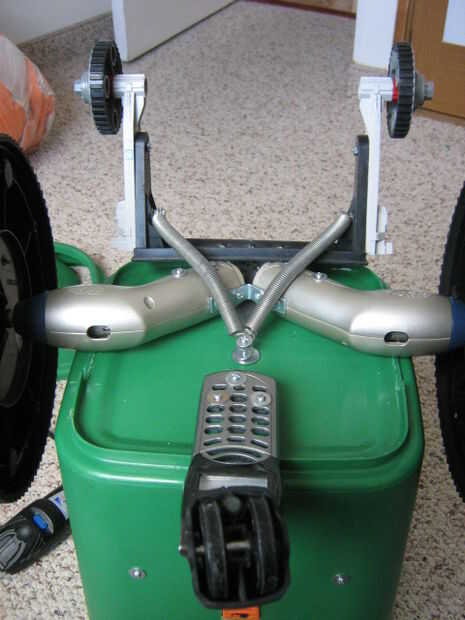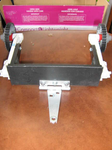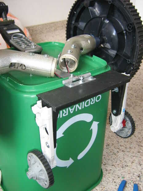 Entonces, ate el pedazo de ruedas auxiliares a la papelera, mediante una bisagra y resortes de amortiguador.