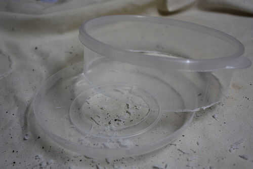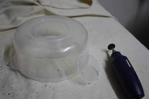 Primero tomamos el recipiente plástico de alimentos y corte un orificio en la base, un poco más grande que el filtro UV.
