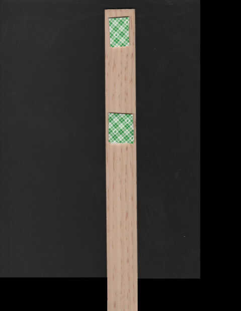 Cortar dos pequeñas tiras de la 1" ancho montando la cinta, no más de tres cuartas partes de una pulgada. Quitar un lado de la base. Aplicar uno de estos pedacitos de cinta en el extremo llano de la varilla de mezclar (no el extremo del mango que tiene las muescas). Aplique el otro poco de cinta cerca de 4 pulgadas más abajo, como se muestra aquí. Retire la película en el lado expuesto de la cinta montada.