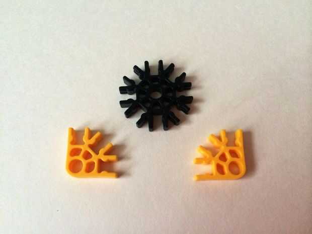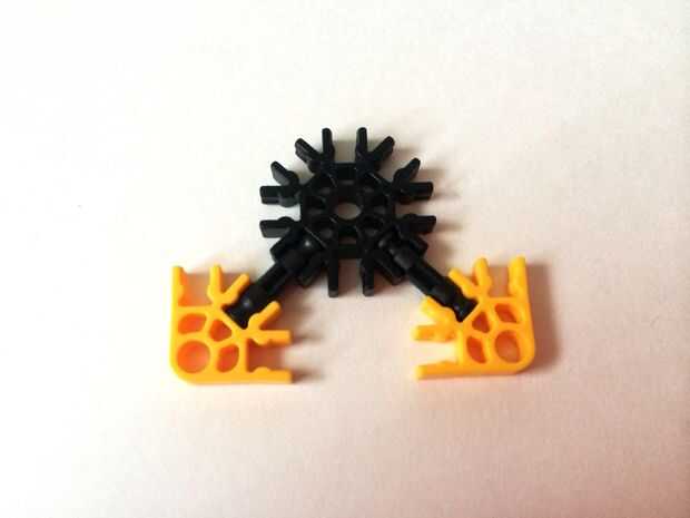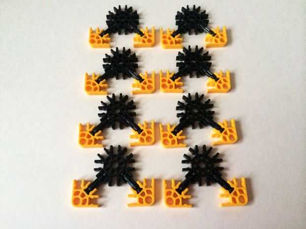 Para construir los componentes básicos del riel táctico inverso, instale dos conectores amarillos a un conector negro con dos barras negras, como se muestra en fotos 1 y 2. Repita este proceso para crear un total de ocho piezas como en imagen 3. También crea dos piezas similares, pero con conectores de gran agujero azul en lugar de conectores negros como en cuadros 4 y 5.