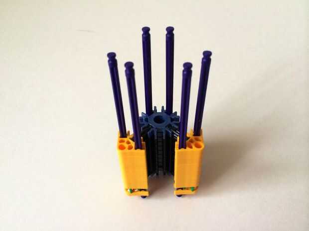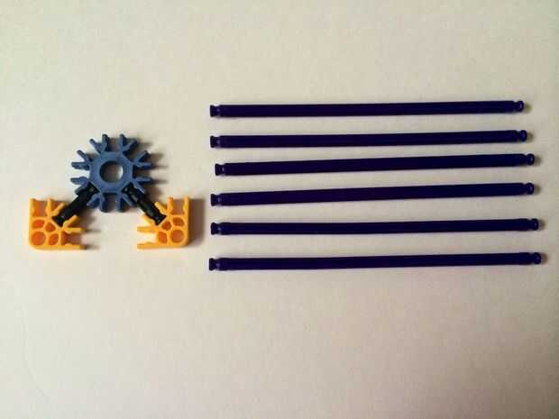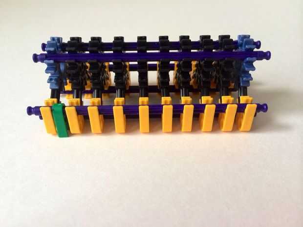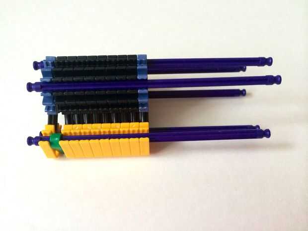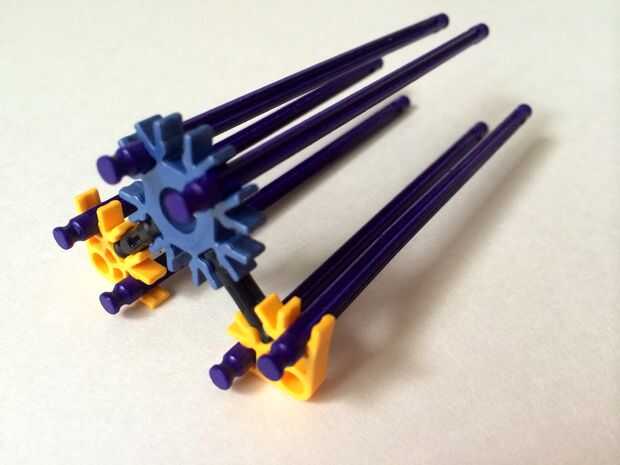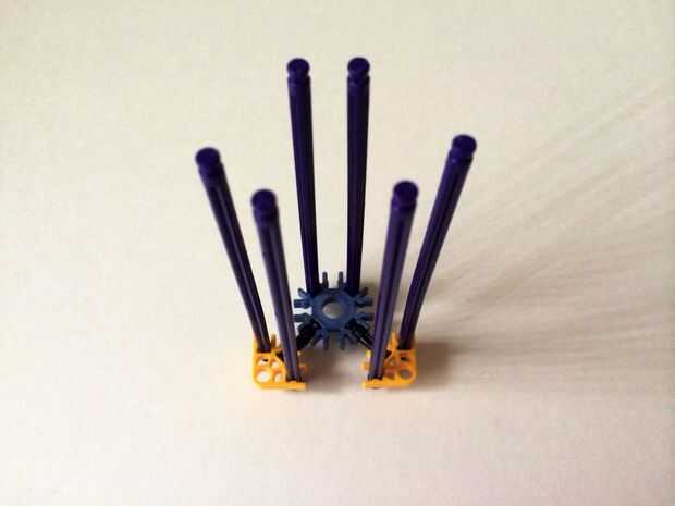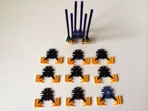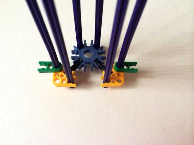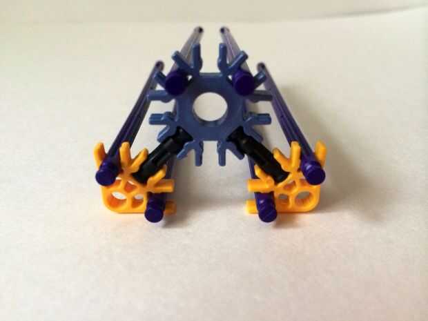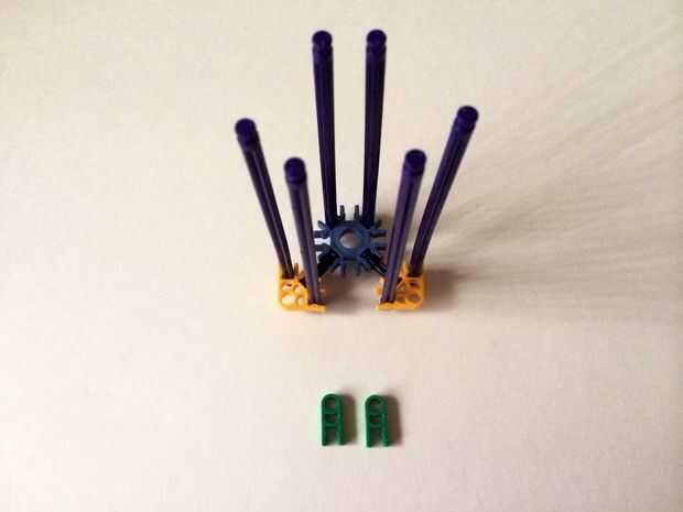 Añadir una barra de púrpura a cada una de las aberturas en un pedazo de Tac-carril inverso con un conector de gran agujero azul, como se muestra en fotos 1, 2, 3 y 4. A continuación añadir dos conectores verde lazo a las barras púrpura indicadas en fotos 5, 6 y 7. Luego continuar agregando piezas de Tac-carril inversos en el orden indicado en cuadros 8 y 9. Por último, difundir las piezas uniformemente hacia fuera en las barras de color púrpura, como se muestra en ilustración 10.