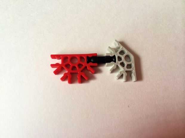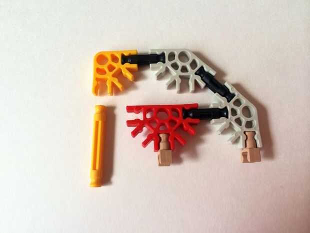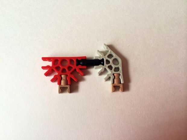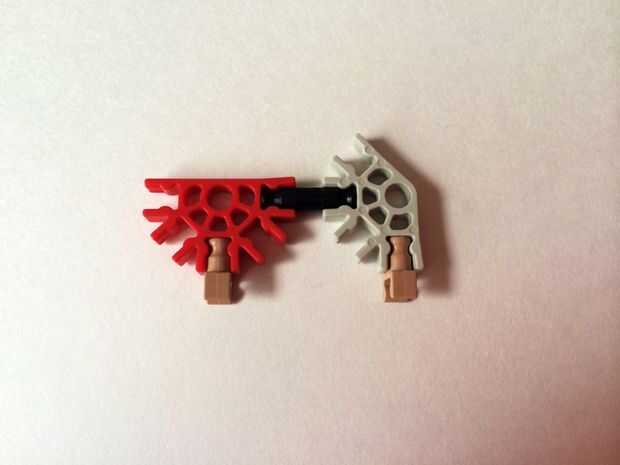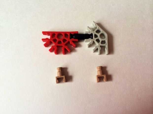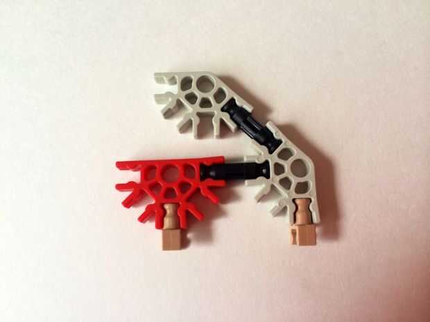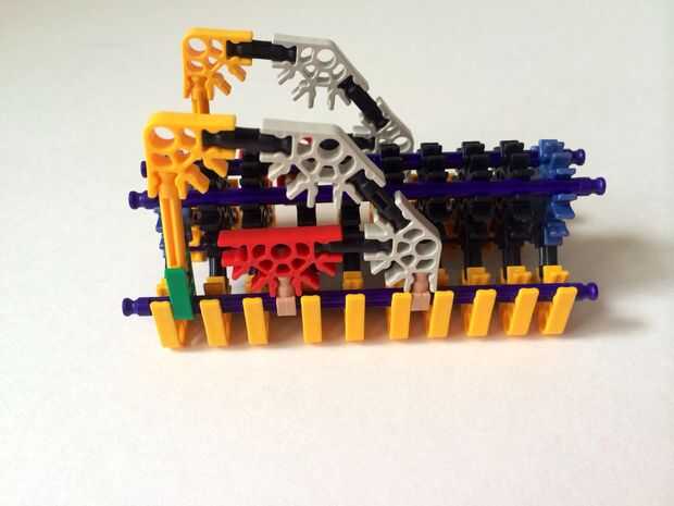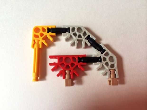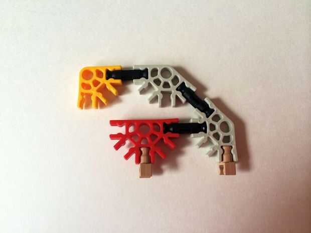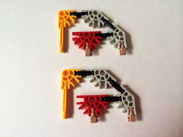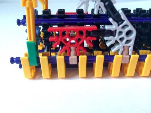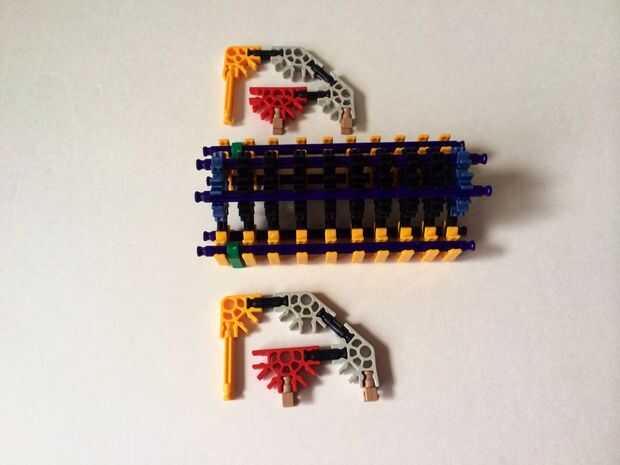Para construir los lados, fije un conector de red a un conector gris con una varilla negra como en fotos 1 y 2. A continuación, agregue dos conectores tan "Y" como en fotos 3 y 4. Gire los conectores "Y" 90 grados como se muestra en cuadro 5. Agregar otro conector gris con una varilla negra como en la figura 6 y agregar un conector amarillo y una barra amarilla como en cuadros 7, 8 y 9. Repita el proceso para obtener dos caras idénticas (cuadro 10). Añadir los lados a la pieza de Tac-carril inversa como se muestra en fotos 11 y 12; los conectores verde lazo deben ser conectados a las barras del amarillo como se muestra en imagen 13.