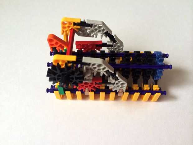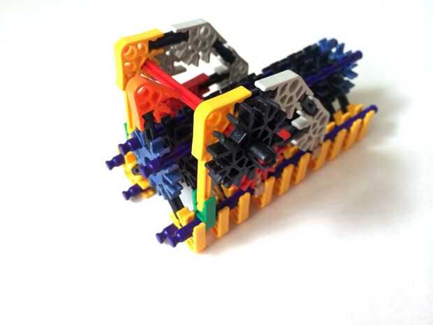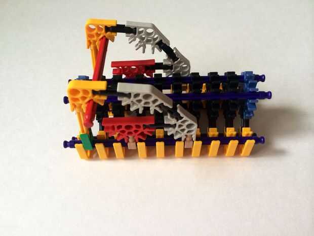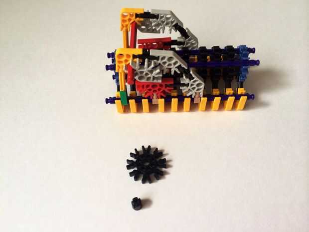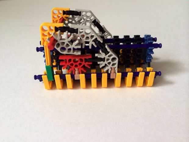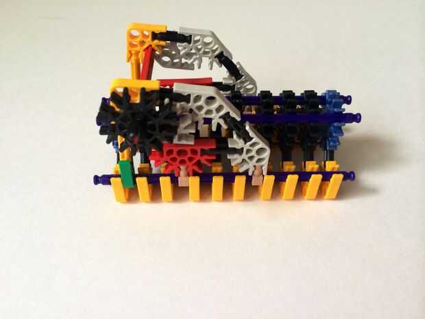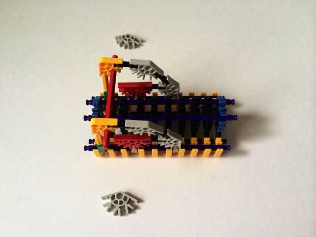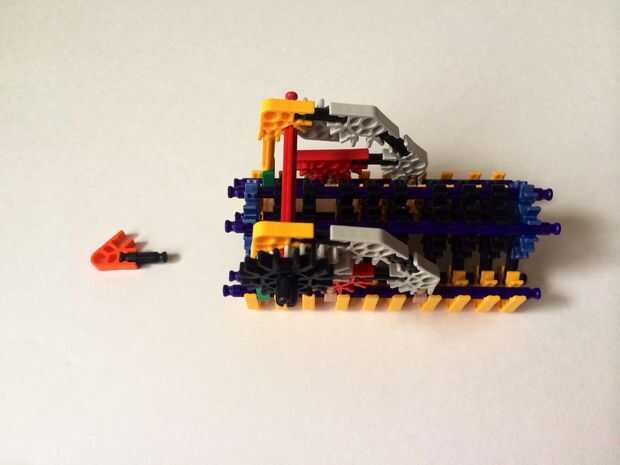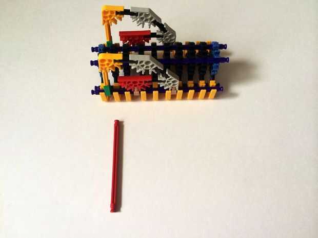 En primer lugar, añadir una barra roja en el volumen como se muestra en fotos 1 y 2. A continuación, agregar un conector gris a cada lado, asegurándose de que se enfrentan en la dirección correcta, como en fotos 3 y 4. La esfera viene a continuación, añadir a un extremo de la varilla roja desde el inicio de este proceso y asegurar con un gorro negro, como en fotos 5 y 6. Por último, añadir la pieza naranja vista a la pieza de frente azul con una varilla negra, como se muestra en cuadros 7, 8, 9, 10 y 11.