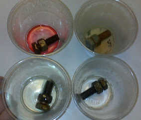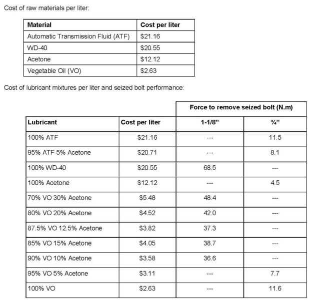 Aceite vegetal con acetona al cinco por ciento trabaja. Aumento de la acetona al 10% o hasta un 30 por ciento aumenta la performance. En concentraciones más altas, puede liberar el perno agarrado con menos de la mitad de la fuerza que se necesita con WD-40.