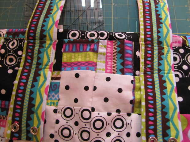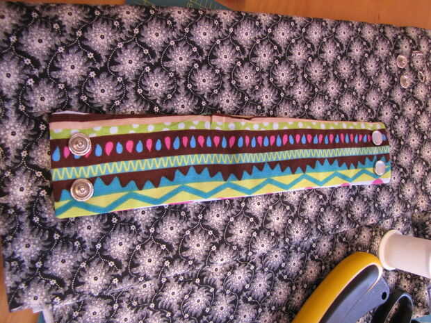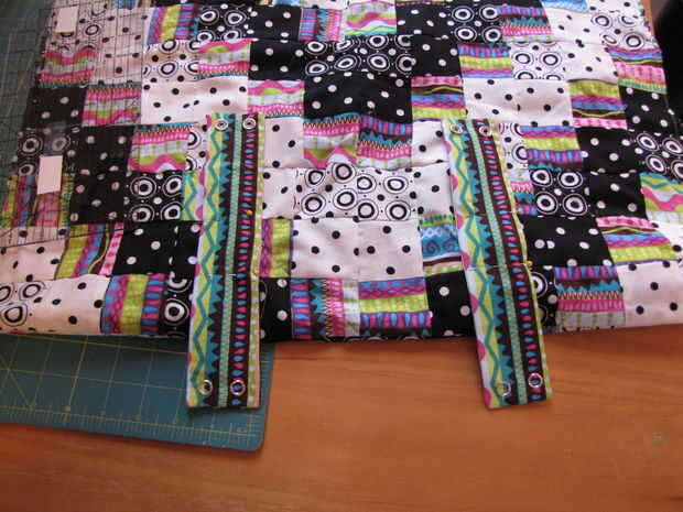 Ahora usted está todavía en medio de su tejido, y sus lazos necesitan mudarse, medir 3 pulgadas desde el centro y centro de su correa, presionado con los pernos que mantenga pulsada un área de 2 pulgadas. Repito, desde la línea de centro en el otro lado. (prestar atención a cómo son tus broches o los ojales. Usted debe poner colgar su edredón en el asiento del coche que tengas, o una suspensión si usted está haciendo como un regalo sólo para asegurarse de que se ve la forma que desee)