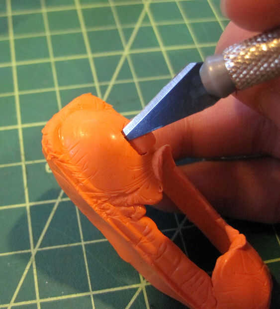 Usando la cuchilla x-acto, corte con cuidado la perilla de la boca. Meter la punta del cuchillo hacia abajo desde la parte inferior y debe alinearse con el mando superior. (Ya que este corte parte no estaba expuesto a mucho aire, todavía era muy blandita y usable - era capaz de hacer un agarre con textura para mi lápiz y pies antideslizantes para una jabonera con este poco)