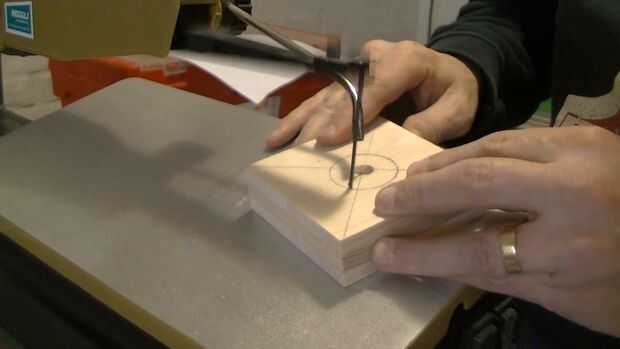 Después de taladrar un orificio de salida en todas las capas, puedo recortar los círculos en la Sierra de calar. Para obtener la dimensión adecuada para el segundo círculo tappered, tengo que esperar hasta que se corta el primer círculo tappered. Una vez hecho esto pueden transferirse desde el primero de ellos.