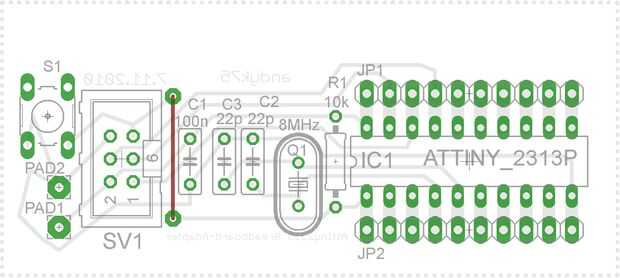 Usted puede construir esto en algún tablero perforado en blanco o puede grabar un directorio dedicado para él. Elegí lo segundo, porque es muy limpio. En un tablero en blanco tendrías que utilizar cables para conectar las clavijas según los esquemas. Pero eso es también aceptable.