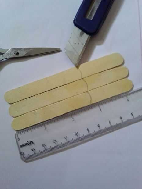 Cortar tres palos de paletas a la longitud de 7,4 cm o de 2,8 pulgadas. No tire el pedazo restante. la utilizaremos en el paso 5.