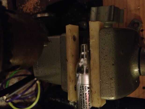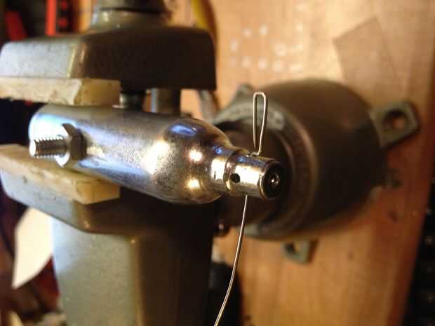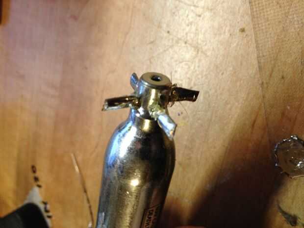 Con el tanque de CO2 sigue en el vicio el taladro un agujero de 1/16 de pulgada cerca del extremo del pico verticalmente con el perno y otra horizontal perpendicular a la otra, esto es fueron las aletas pasará por. usar un alambre más, doble en un rectángulo pequeño Inserte el cable restante a través de un agujero y doblar el otro lado en otro rectángulo como cerca del agujero como sea posible, hacer esto para ambos orificios. ahora soldar las aberturas en los rectángulos hasta que se cerraron.