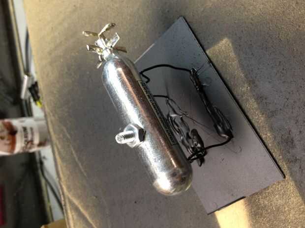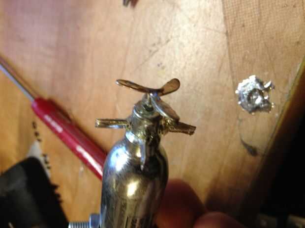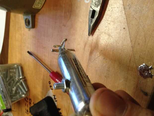 Pegar las aletas para que ejecute en línea con el cilindro y coloque el "tallo" de la hélice en el orificio en el extremo y pegamento en su lugar, puede utilizar pegamento caliente para sellar el agujero en la parte inferior del cerrojo. una vez lugar sobre un soporte seco y rociar pintura negra.