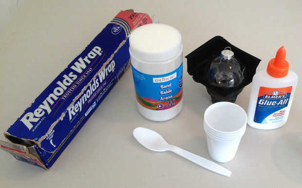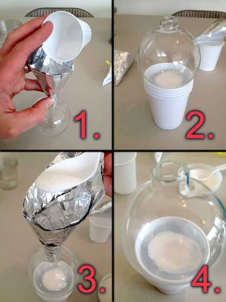 Utilice el otro embudo para verter la arena blanca en la mezcla de pegamento y agua. Use la otra cuchara desechable para obtener una pequeña cantidad de la arena blanca (ver foto). Como la arena se corre por el embudo, puede girar el adorno de vidrio ligeramente para obtener la arena por todas partes que es el agua del pegamento.