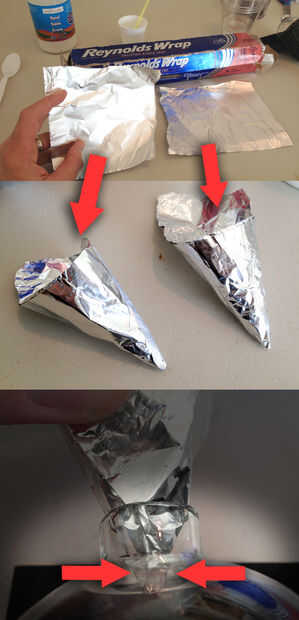 RIP de 2 plazas, doblar cada uno por la mitad, envolver alrededor de los lados en un cono, asegúrese de que hay una pequeña abertura en la punta y finalmente utilizar la cinta para mantener juntos los embudos.