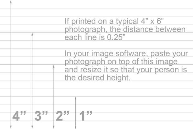 Por ejemplo: Si se va a conseguir una esfera de cristal es de 6 pulgadas de diámetro, y decir quería su persona para ser aproximadamente 2 pulgadas de alto. Entonces tomar su altura deseada (2"), dividirlo por la altura de la foto (4") y multiplicar por 100%, para lograr un 50%. Eso significaría que la persona debe tomar aproximadamente el 50% (aka. "la mitad") de la altura de la foto.